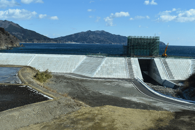 甫嶺駅付近でも防潮堤が建設され、水門の工事が行われていました。複雑な海岸線を描く美しい海、今日は穏やかな表情を見せていて、津波の脅威が襲ったことは、すぐには想像できません。なお北リアス線乗車時と同様に、清掃が行き届いており、また車両が新しいこともあるでしょうが、窓ガラスが綺麗でストレスなく車窓を堪能することができました。 (2018.2.18 11:32)