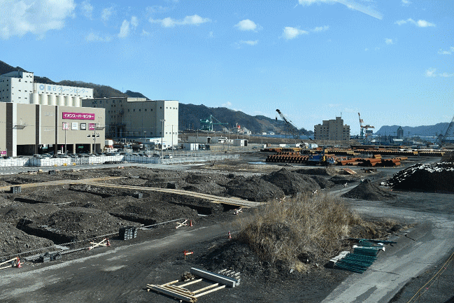 釜石駅を発車直後の車窓から、右奥が釜石港、左手にイオンタウン釜石があり、釜石の中心街はさらに左奥です。この辺りは津波の被害があったのか、造成工事が行われています。(2018.2.18 10:56)