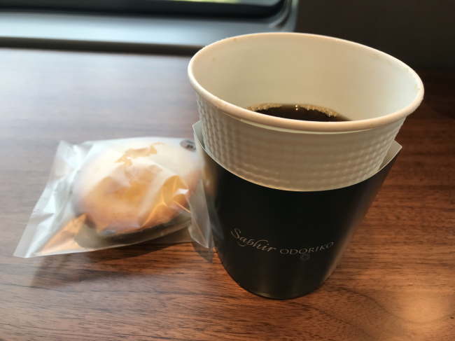 速攻で時間が来て、コーヒーなどはとても座席で飲む余裕などなく、座席に持ち帰りました。アテンダントが不慣れで、コーヒーが出てくるまで、結構な時間を、立ちんぼで待ちました。コーヒーの脇に見えているのは、同時に購入したマドレーヌです。