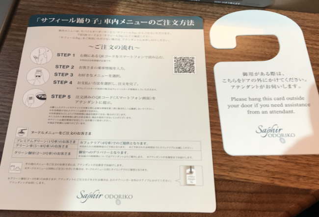 個室内には、車内メニューの注文方法が書かれていました。そして、個室のドアに、アテンダントの訪問を希望するマークを付けておきます。注文は、「サフィールペイ」を使います。