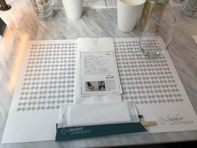 テーブルは大理石調。紙製のランチョンマットが敷かれてミネラルウォーターやコップも準備されて、すぐに座席まで通されました。時間ごとに予約制になっているため、指定された時間までに行けばOKです。
