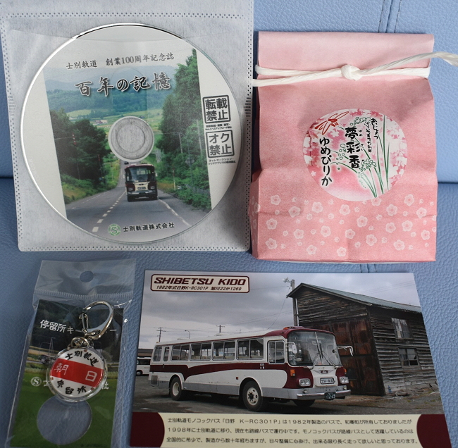 乗車記念品です。上士別産のお米2合は士別市内で宿泊または飲食するといただけます。左下キーホルダーは福引で、ポストカードはアンケート記入で頂戴いたしました。