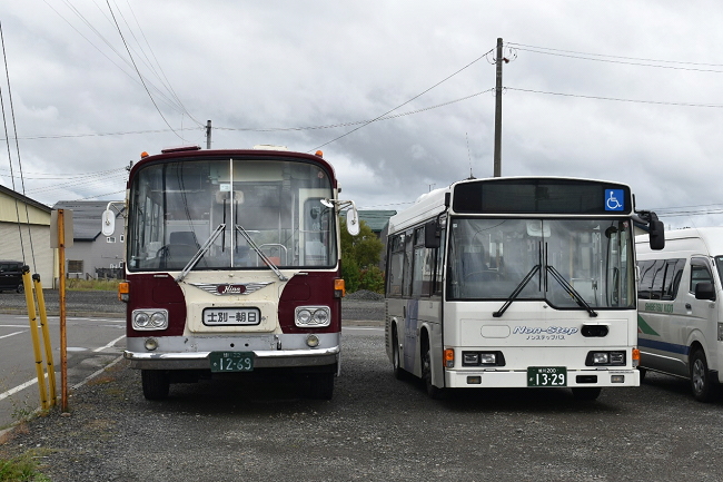 モノコックバスと対面。1982年(昭和57年)日野製で、当初は和寒町の自家用だったそうです。右側のノンステップバスに比べると車高の違いが大きいです。モノコックバス以外にも台数は少ないにもかかわらず、車種のバラエティが富んでいました。