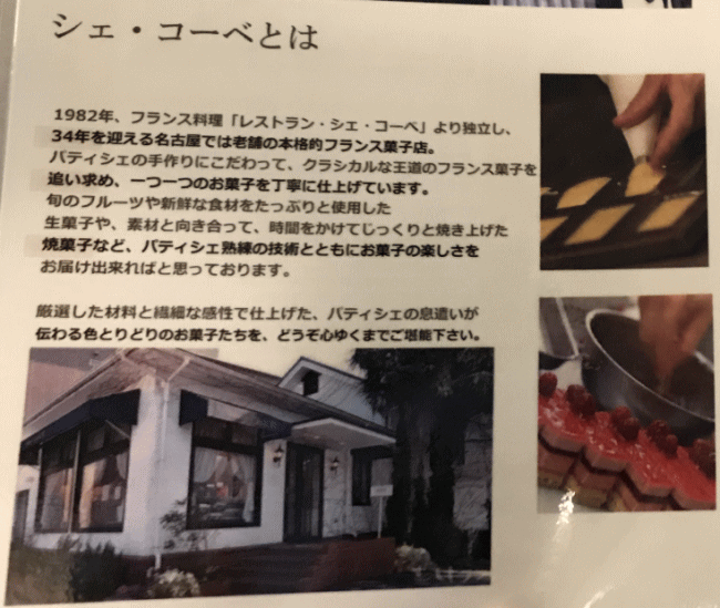 車内に積み込まれているケーキ類は、名古屋のフランス菓子店のシェ・コーベさんによって作られたものです。メニューに書かれていた案内書きを貼り付けておきます。