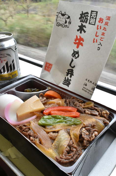 昼食は下今市から楡木まで乗車した普通列車内で「栃木牛めし弁当」(㈱油源・1000円)を食しました。ロングシート車となったら、さすがに列車内でビールと駅弁は実行できなくなります。