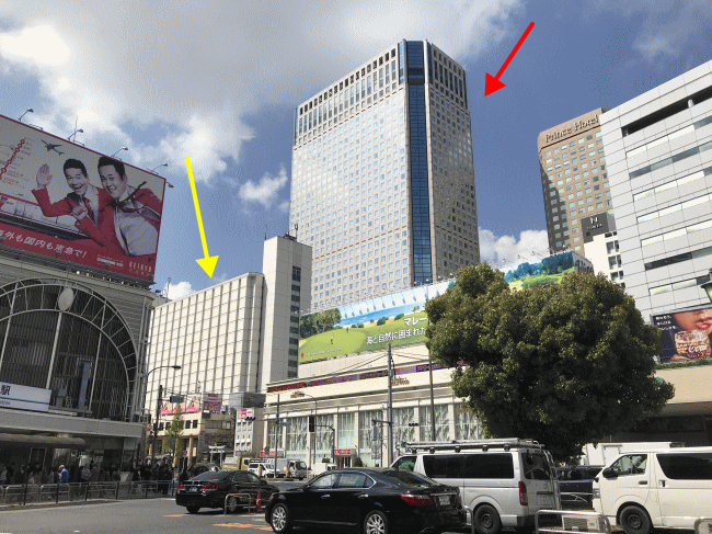 今回ご紹介するメインタワーは、下記の写真の赤い矢印のビルになります。(ちなみにイーストタワーは、その下、手前側の黄色い矢印のビルです)
