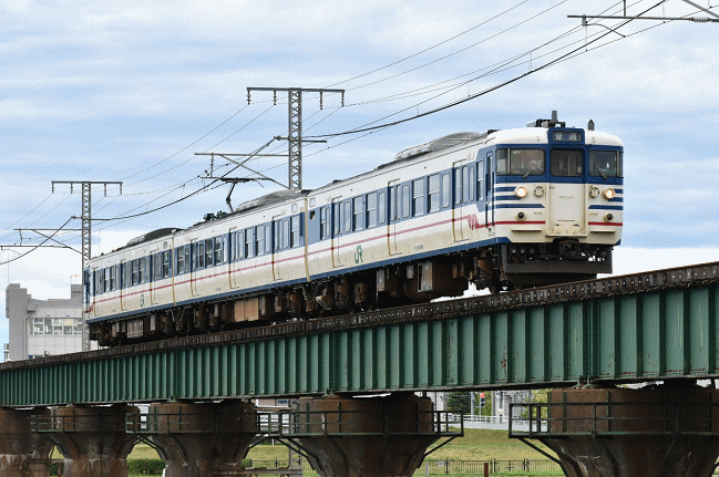 朝に寺泊~分水の大河津分水路鉄橋で撮影した同じ編成による新潟行が信濃川鉄橋を通過します。残念ながらお天気は回復しません。晴天ならなんとか順光となる予定でした。 (2018.8.24 11:54)