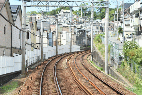 湊川を出発し、地下から地上部で出ると、線路は神戸電鉄らしい急勾配となります。(列車先頭部から撮影)