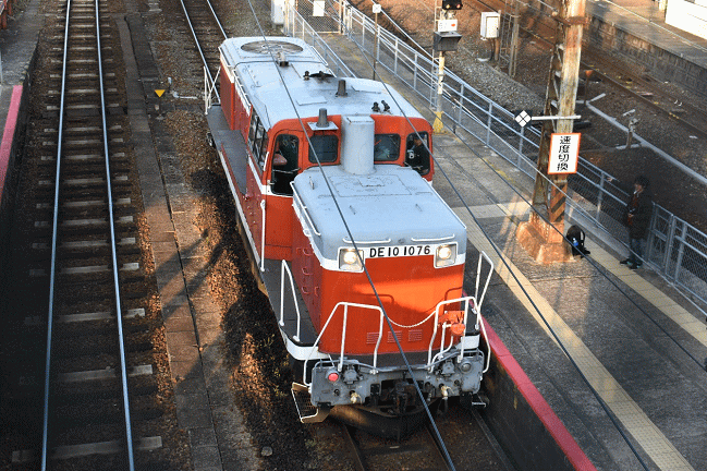 SL「やまぐち」号は新山口駅の2番線ホームに17:30着、すぐに客車回送用にDE10がやってきます。駅の在来線口と新幹線口を結ぶ連絡通路(歩道橋)上からの撮影ですが、柵の隙間が小さくて苦労しました。(2018.3.25 17:36)