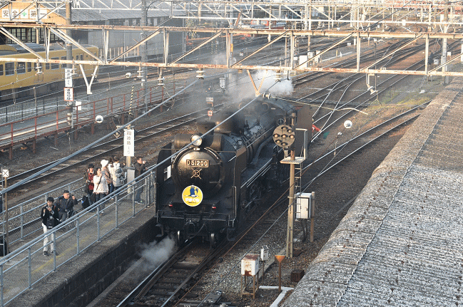 新山口駅の一番北側に位置する1番線ホームに、SL「やまぐち」号がD51の推進運転でゆっくりと入線します。(2018.3.24 10:24)