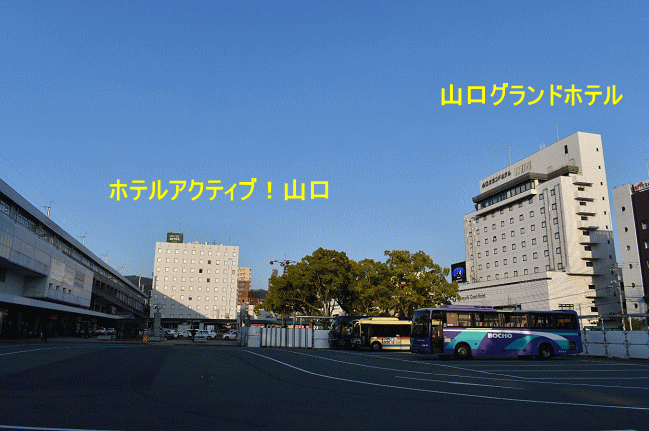 左側の新山口駅新幹線口駅舎の真正面(写真右側)に位置する「山口グランドホテル」です。写真中央少し左寄、駅舎に隣接する「ホテルアクティブ!山口」の駅舎側上層階からはトレインビューが期待できそうです。なお新幹線口からは発着していた萩、秋芳洞、宇部方面のバスは、この4月から在来線口に新設されたバスターミナル発着に変更されました。新幹線ホームから遠くなり、不便になってしまった感があります。