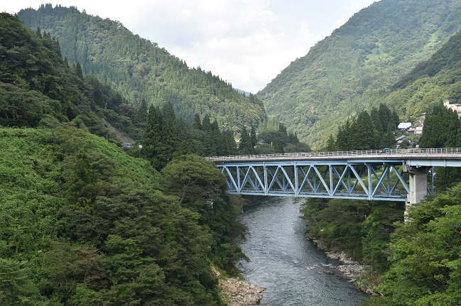 飛越峡合掌ライン(国道156号線)湯出島橋のバス車窓です。庄川を何度か渡りつつ城端に向けて進行します。