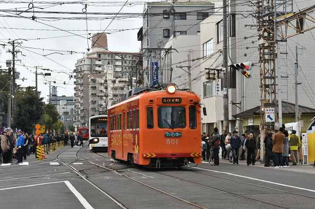 続いて何と!トップナンバーの161号がやってきました。これで161形の稼働車4両全車を撮影することができ、新春から「鉄運」のいいことです。161号は車内外とも1965年(昭和40年)当時の姿に復元されています。現在は貸切での運行が中心で一般営業に供される機会はごく僅かだそうですが、本日は稼働しており貴重な姿を目にすることができました。 (2019.1.2 12:54)