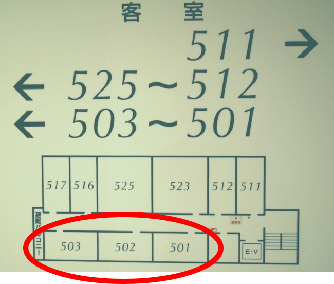 私が泊ったのは5階の502号室です。501号室、502号室、503号室から、線路側の景色が良く見えます。高さ的には、出来れば最上階の5階を取りたいところです。