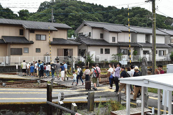 3回目となる今回、2017年8月12日(土)13:50開始の部は、参加者は約50名。過去の参加時は10~20名程だったと記憶していますので、本日は驚きの大盛況です。駅待合室で集合(収容しきれずに駅舎外へ続く長い列となりました。)、スタッフの方による引率で駅構内を横断して転車台方面に向かいます。