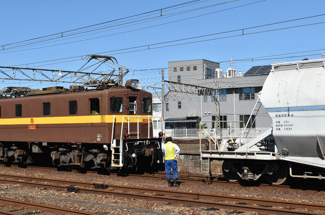 すぐに機回しされ、ホキの反対側に電気機関車が連結されます。(2018.10.8 13:12)