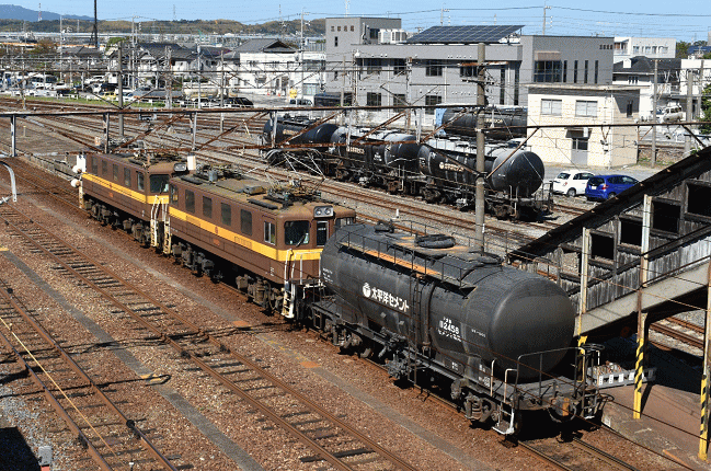 再び富田駅に戻り、12:42に四日市を発車したコンテナ列車2080列車を撮影します。分刻みでの撮影活動でわけがわからなくなります。この列車、富田駅では中線に入線し一旦停止するものの、特に他の列車の退避等はなくすぐに発車します。1146号機は旋回窓が特徴です。(2018.10.8 12:50)