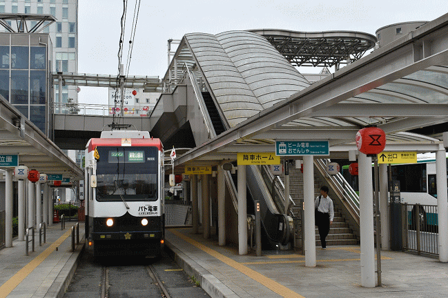 豊橋駅から歩行者用デッキで直結されて便利な市内線の電停です。ここで市内線一日乗車券(400円)を券売機で購入します。ちなみに1回の乗車は150円均一です。到着し折り返し運動公園前行となった801号パト電車に乗ります。(2018.10.19 12:41)