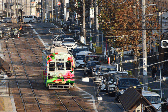 午後3時過ぎからやっと日が射してきました。前畑電停にて赤岩口行の花電車を後追いで撮影します。(2018.10.19 15:27)
