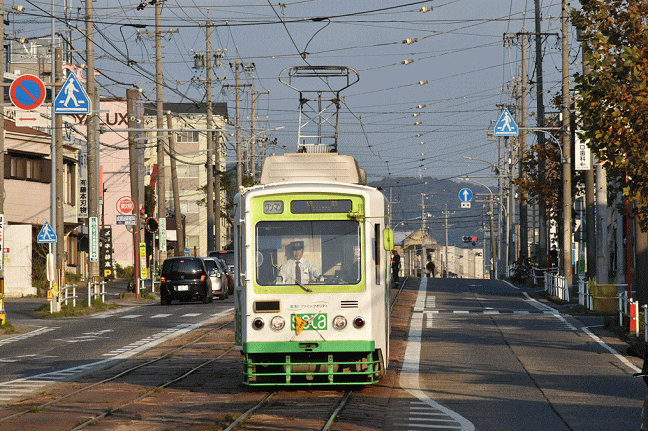 競輪場前電停の乗降場から先は単線となるため、赤岩口・運動公園前行の電車は電停の手前で駅前行を待つことが多いです。そのため形式写真を撮影するには好都合な場所です。 (2018.10.19 14:22)