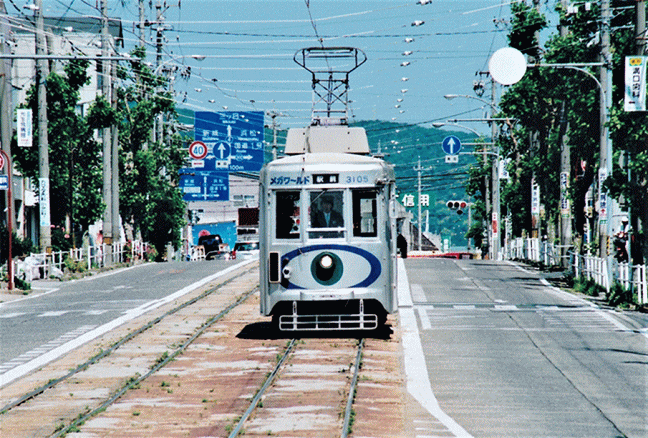 定点観測です。この13年間で車両は大きく変わりました。この元名古屋市電のモ3100形は冷房化され主力車両として活躍してきましたが、名鉄岐阜地区の車両導入により2006年(平成18年)までに1両を除き廃車されました。イベント用として残されたモ3102号は2011年まで使用されたものの、惜しくも2018年に解体されたそうです。(2005.5.25)
