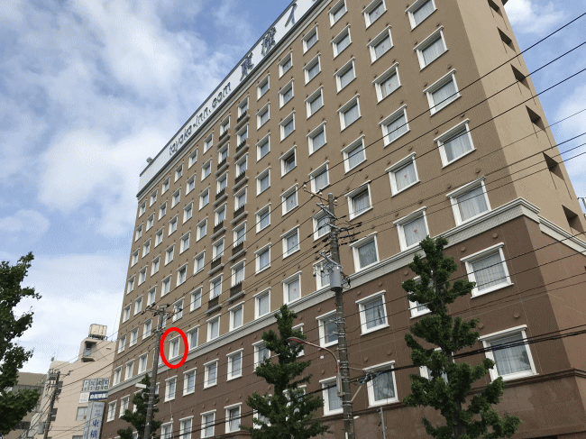 さぞや東海道本線の好展望台なのかと思って、以下のように4階の部屋(赤丸の部分に泊まりました)から鉄道を眺めようと喜び勇んで出かけた訳ですが・・・。