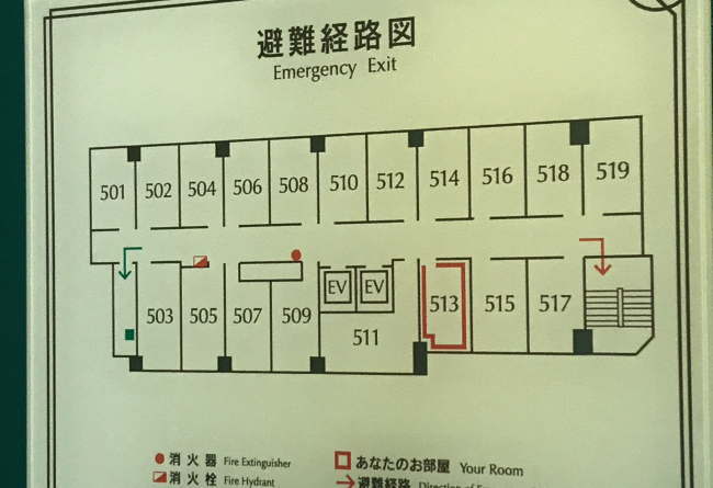 通されたのは5階の513号室。向かって下側が、今までご覧頂いたトレインビュー側と反対側の客室になります。シングルの部屋に宿泊しています。