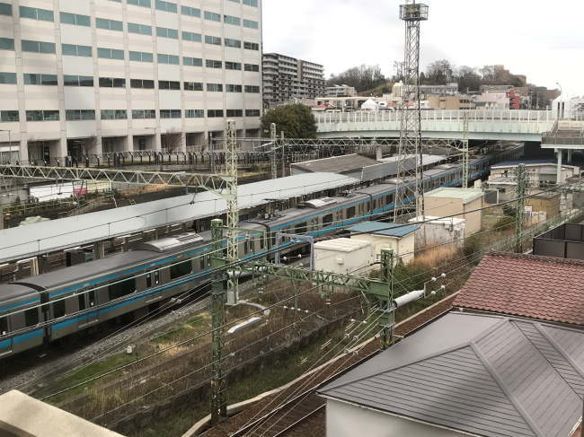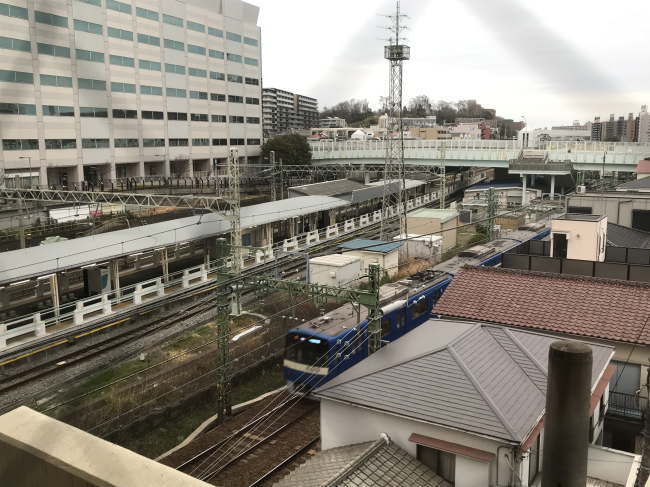 こちらはその反対側から眺めたところで、JRの新子安駅のホームから見ています。東横インに電話連絡をしてトレインビューの部屋を希望すると、こちら側の客室に案内されます。