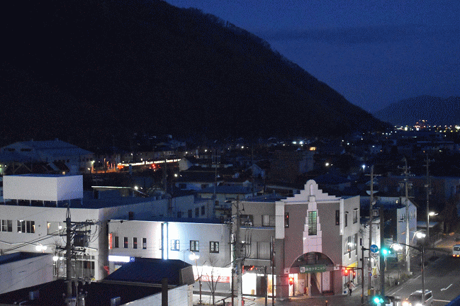 「ホテルルートインコート千曲更埴」の610号室は、周囲に高い建物がないため、駅や市街地、その周辺の良好な展望が得られます。トレインビューとはいえないまでも、遠くに列車の姿を望むことが出来ました。(2018.3.11 18:22)