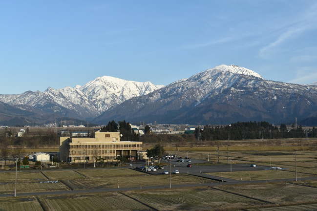 浦佐駅を通過すると南魚沼市役所大和庁舎の向こうに、お酒の方が有名(?)な八海山を眺めることができました。十数年振りの上越新幹線で一人旅ならぼんやり眺めているだけの景色も、車窓風景に詳しいP氏の解説があることによりその楽しさが倍増しました。さすが「乗り鉄の鏡」といえ、私も居眠りばかりでなく真摯に車窓風景に向き合わなければと、決心を新たにしたのでした。