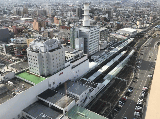 もしもトレインビュー側の部屋が取れなかった場合は、エレベーターホールに行けば、このように新庄駅方向に伸びる奥羽本線を望む事が出来ます。山形城も同時に眺められます。お城を上空から眺めるというロケーションは、トレインビューという観点以外に、貴重かもしれません。
