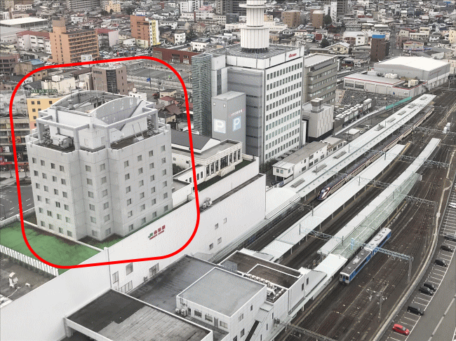 赤枠の部分は、ホテルメトロポリタン山形です。山形駅舎の「頂上」にニョキニョキと生えているので、鉄宿としては完璧なように思うでしょうが、おそらくほとんど鉄道は見えないと思います。一部の部屋から、山形新幹線を望むくらいではないかなあと。