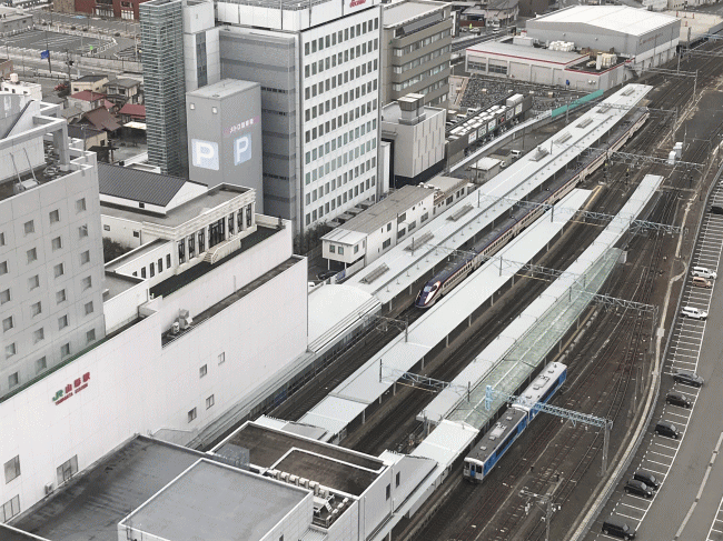 窓から、このように山形駅を見下ろします。駅の屋根に邪魔される事になるので、鉄道の撮影には望遠レンズが必要になりますね。また、当然ながら窓は開きませんので、鉄道の音は小さめです。ほとんど音も無く近づいてくる「獲物」を逃さないように注意しましょう。