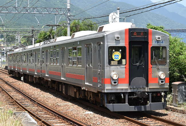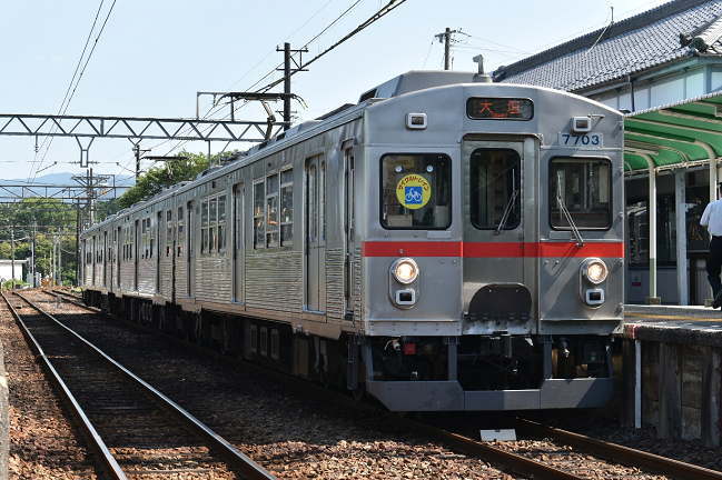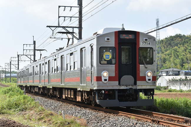 大垣行を撮影します。すっきりとした構図ですが、正面は影になります。元東急の7700系は3連と2連がそれぞれ3編成の計6編成が在籍しており、東急時代の車番がそのまま使用されています。写真のTQ14編成は2020年1月から養老鉄道で営業運転を開始し、東急時代と同じ赤歌舞伎塗色となっています。(2020.6.8 8:49)