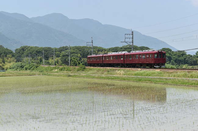 田植えの終わった水田とともに列車を撮影します。この1年間で7700系の導入が続き、旧近鉄車は少数派になってしまった印象です。本日日中に桑名~大垣間で運用されていた3連の旧近鉄車は、この1編成のみでした。(2020.6.8 12:00)