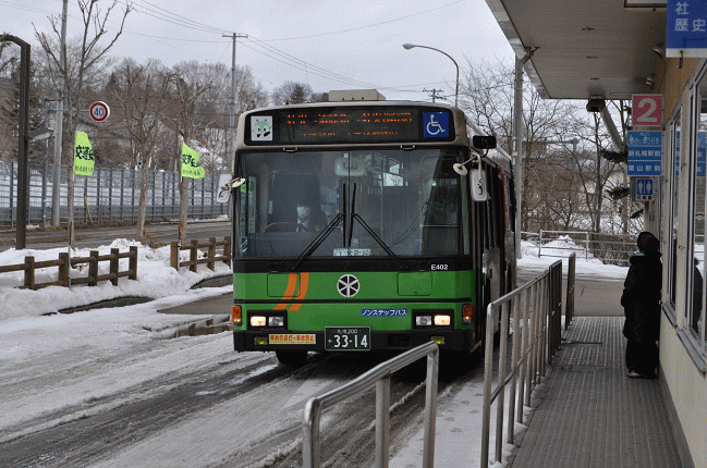 終点の社光バス停に到着。周囲に人家はありませんが、一日8回、バスが発車します。雪の多い地方でも、ノンステップバスを見かけるようになりました。塗装から推測すると、都営バスの中古車両でしょうか。