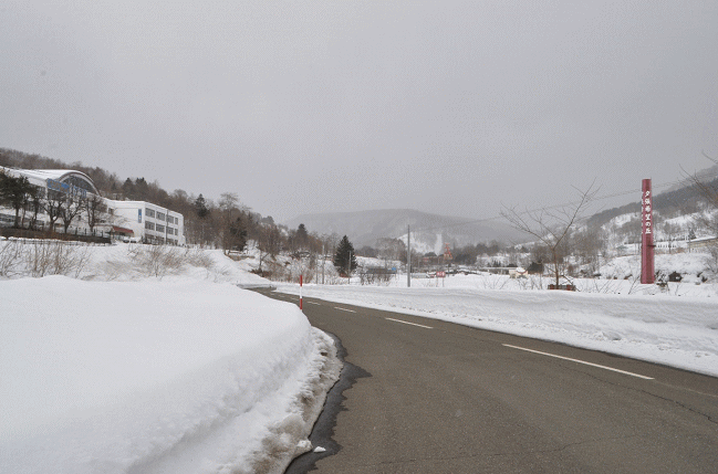 市街地を抜け、坂道を少し進んだところが終点の社光バス停です。乗車時間は約15分。周囲には研修施設のような建物がありますが、施設名の表示はなく、人影もありません。また他に人家等の建物はなく、周囲は雪に覆われています。
