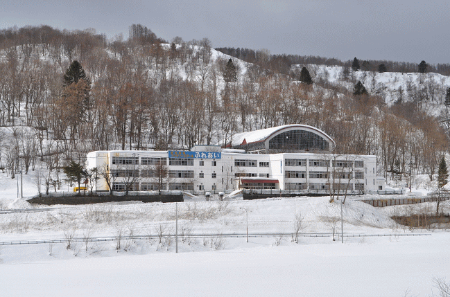 学校跡を宿泊施設とした建物と思われますが、窓ガラスが割れ、利用されている気配はありません。市内の小学校、中学校及び高校を各1校に統合したため、至る所に学校跡と思しき建物が残っています。