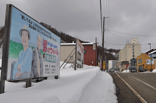 右奥のビルが、故宮脇俊三先生も宿泊したホテルシューパロ。映画祭で知られる夕張。この辺りには映画看板が至る所に設置されています。なお、この3月上旬には「ゆうばり国際ファンタスティック映画祭2017」が開催されています。