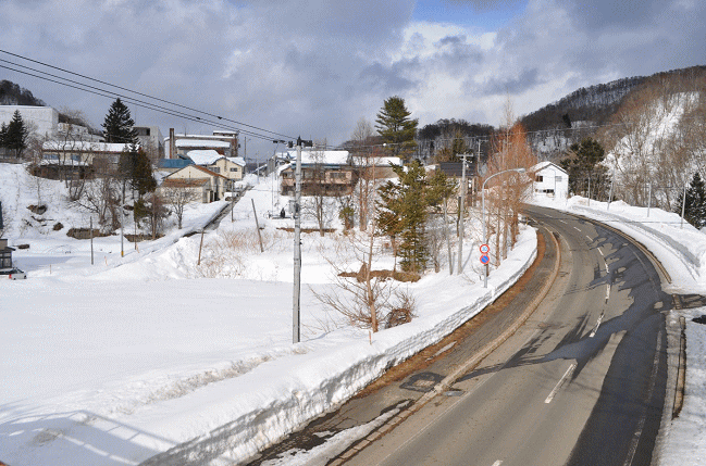 この奥に北炭夕張炭鉱と国鉄夕張駅(第1次夕張駅)があったと思われます。雪でわかりませんが、右側の空き地は駐車場か空き地となっているようです。